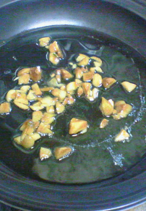 1.まず、にんにくをオリーブオイルで香ばしくロースト・・・。