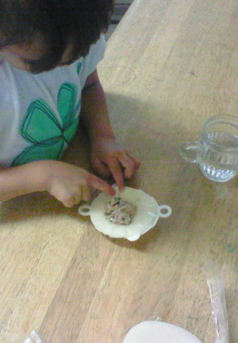 豚ミンチをパックからだし、にんにくをすりよく混ぜます。