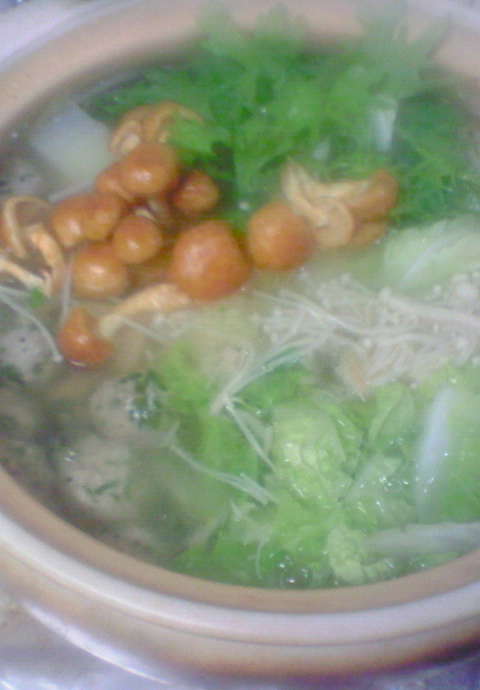 白菜、モヤシ、シメジ、えのき、豆腐など冷蔵庫の野菜を入れます。