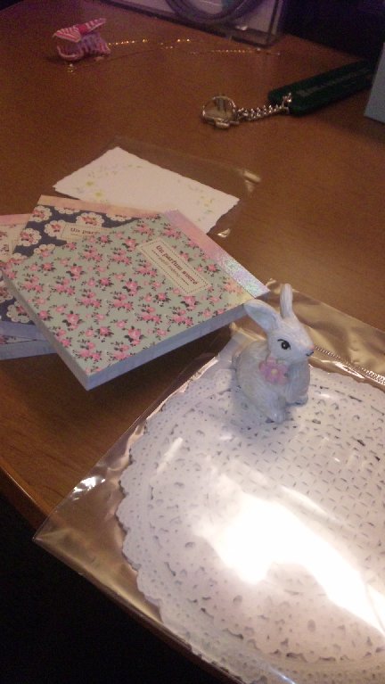 バックとかわいいウサギの置きものとペーパーレースとメモ帳。