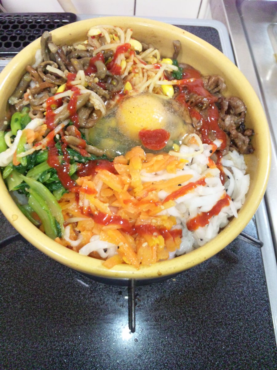 夕食は、ビビンバ・えびグラタン・かにクリームコロッケ・お刺身と豪華になりました。