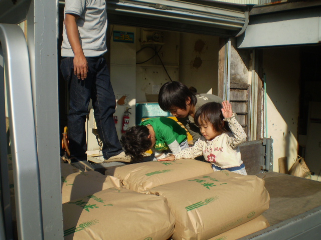 トラックいっぱいにお米の袋を積みました。収穫上々。