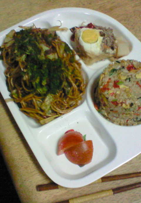 焼き飯・焼きそば、巾着煮物、トマト。。。。。
