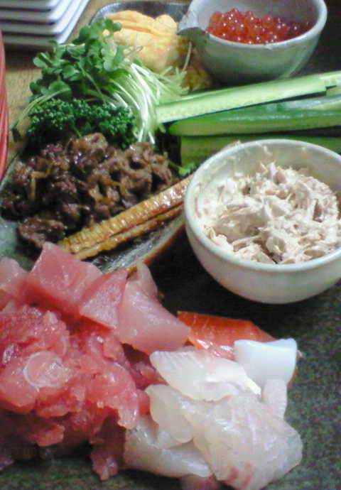 イクラ・マグロ・うなぎ・たまご・シーチキン・牛肉・きゅうり・貝割れ大根・・・を準備。