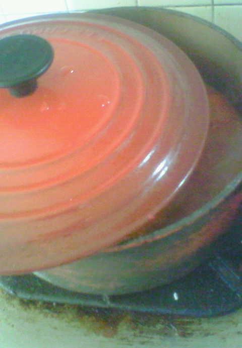 香りづけ・・・。トマト缶・コンソメ固形を1個いれ・ケチャップ塩コショウで味をととのえ、少し煮込み出来上がり。