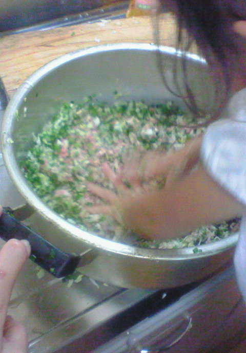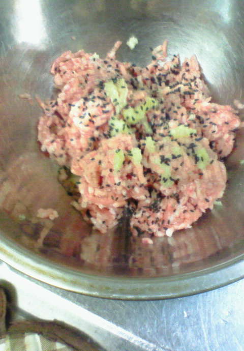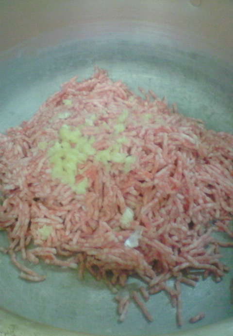 豚ミンチをパックからだし、にんにくをすりよく混ぜます。