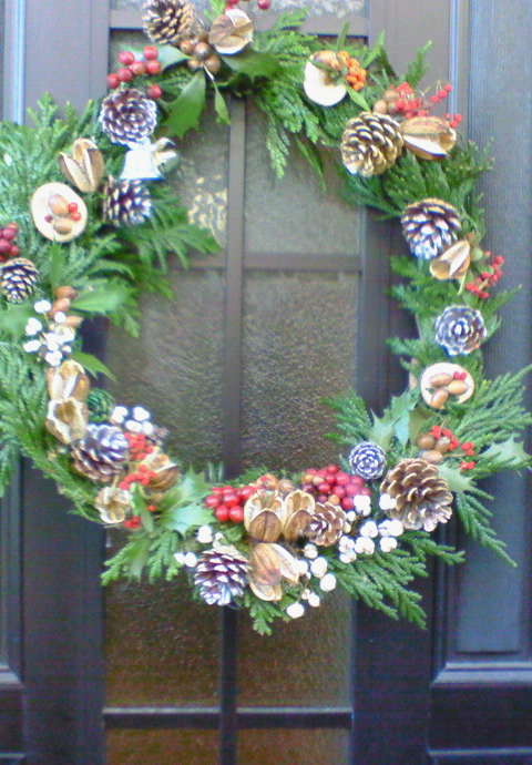 先日作ったクリスマスリース、明るいところで見ると針金やボンドが見えてますが、