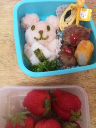 お弁当は、クマさんのおにぎり弁当、ミニハンバーグも朝からコネコネ作りました。