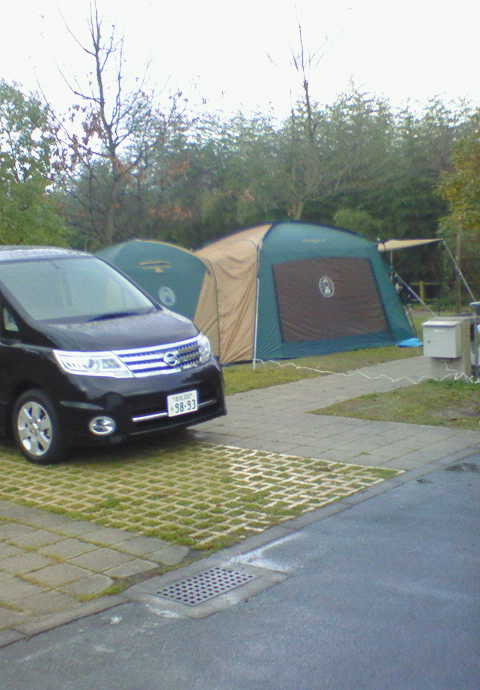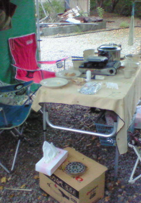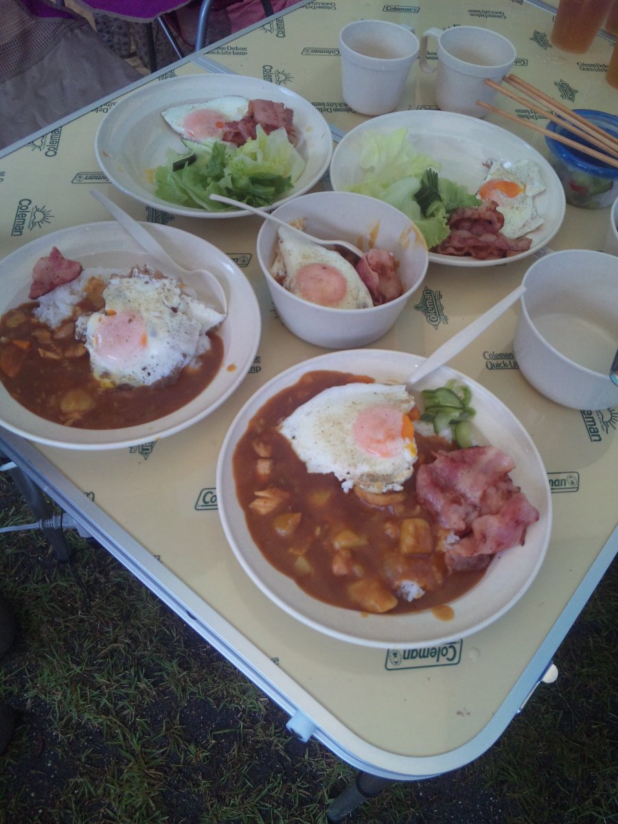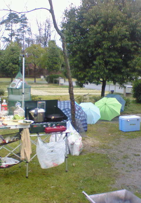 2日目のキャンプ。夜中雨が降ったりやんだりあいにくの天気。