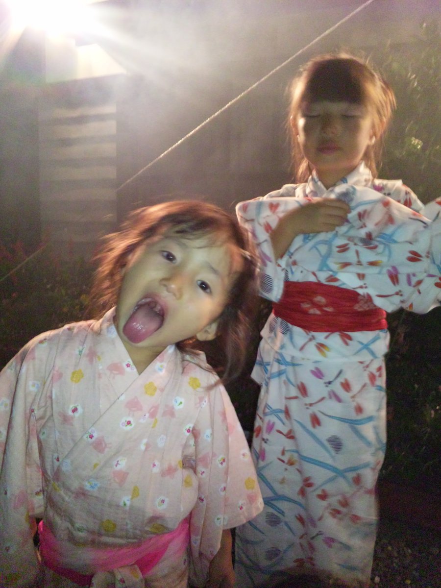 庭で浴衣を着て花火をすることに・・・。