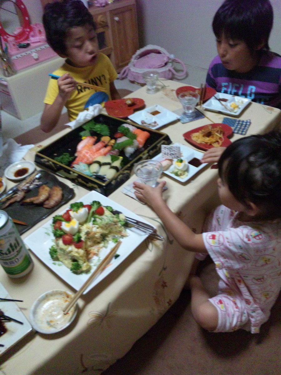 今回は、焼き鳥を焼いたり、トマトソースボンゴレスパゲティを作り、おすしは買いました。