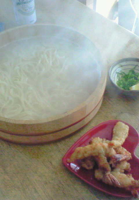 お腹がすいたので私達は釜揚げうどんとエビの天ぷら、かきあげを作り遅い昼食。