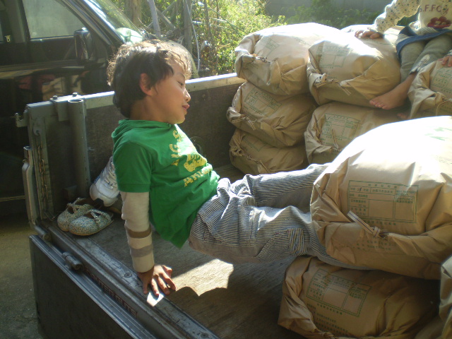 トラックいっぱいにお米の袋を積みました。収穫上々。