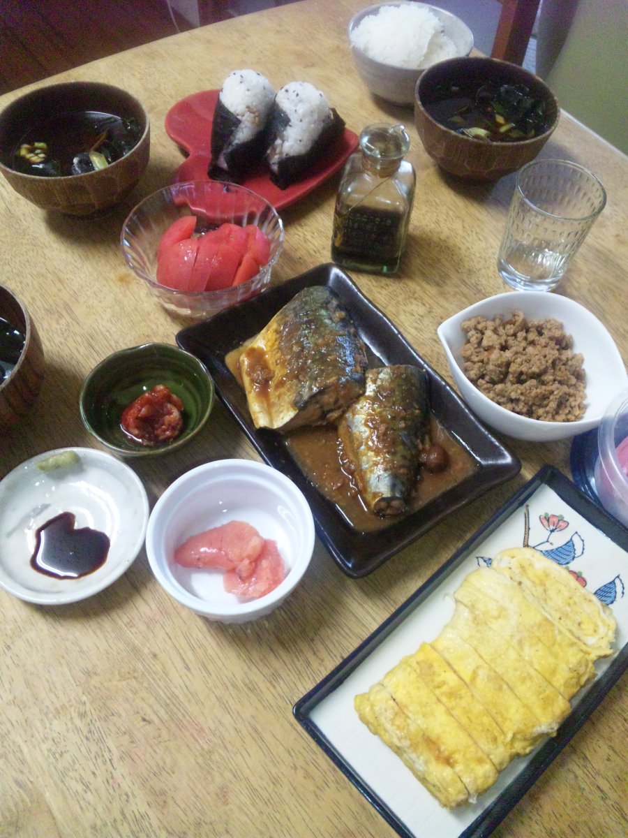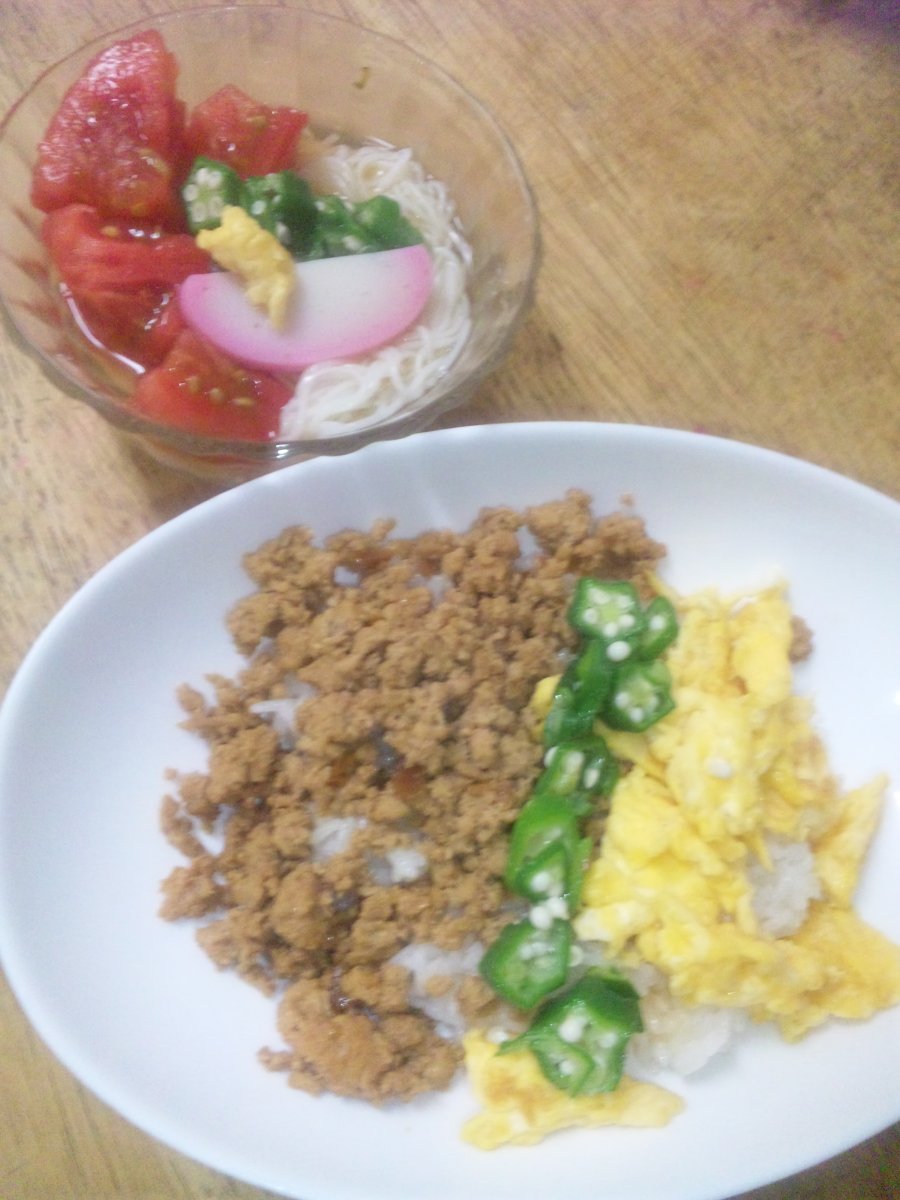 シジミの赤だし・鯖の味噌煮・そぼろどんぶり・そうめん