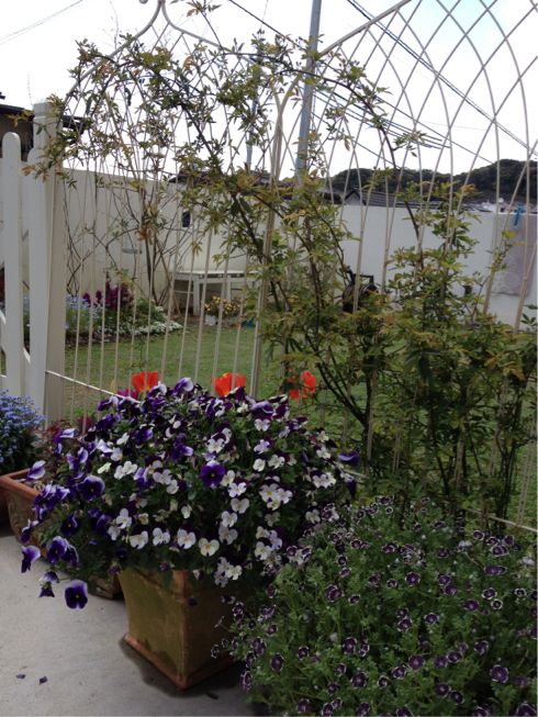 トレリスに絡ませた木香薔薇もたくさん蕾がつきました。