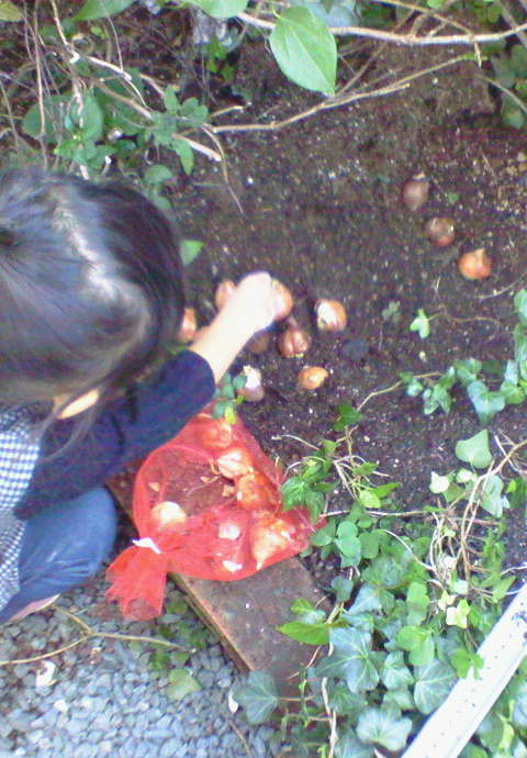 と早速庭の土を掘り返し、球根を並べていきました。けっこう風が冷たくてびっくり・・・