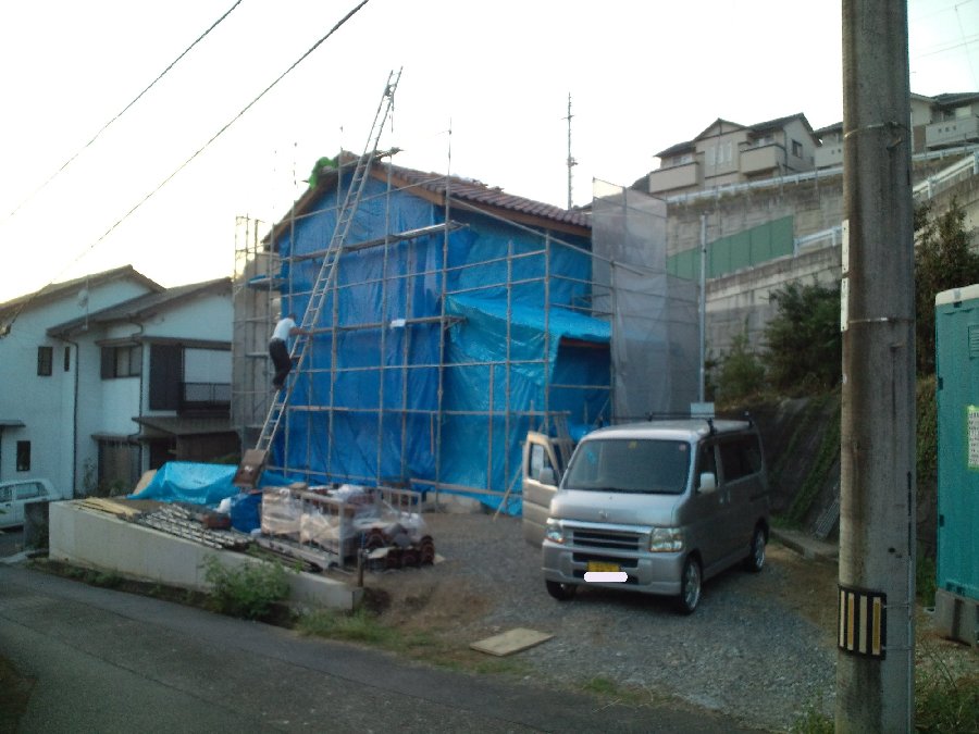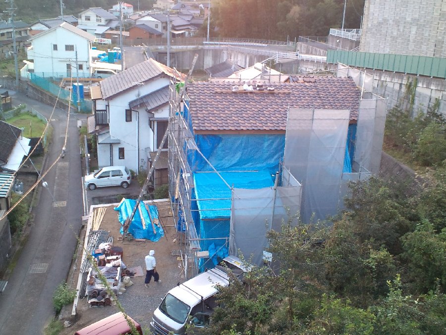 夕方行くと、かわらが半分の屋根一面ついていました。