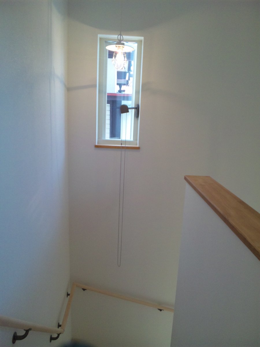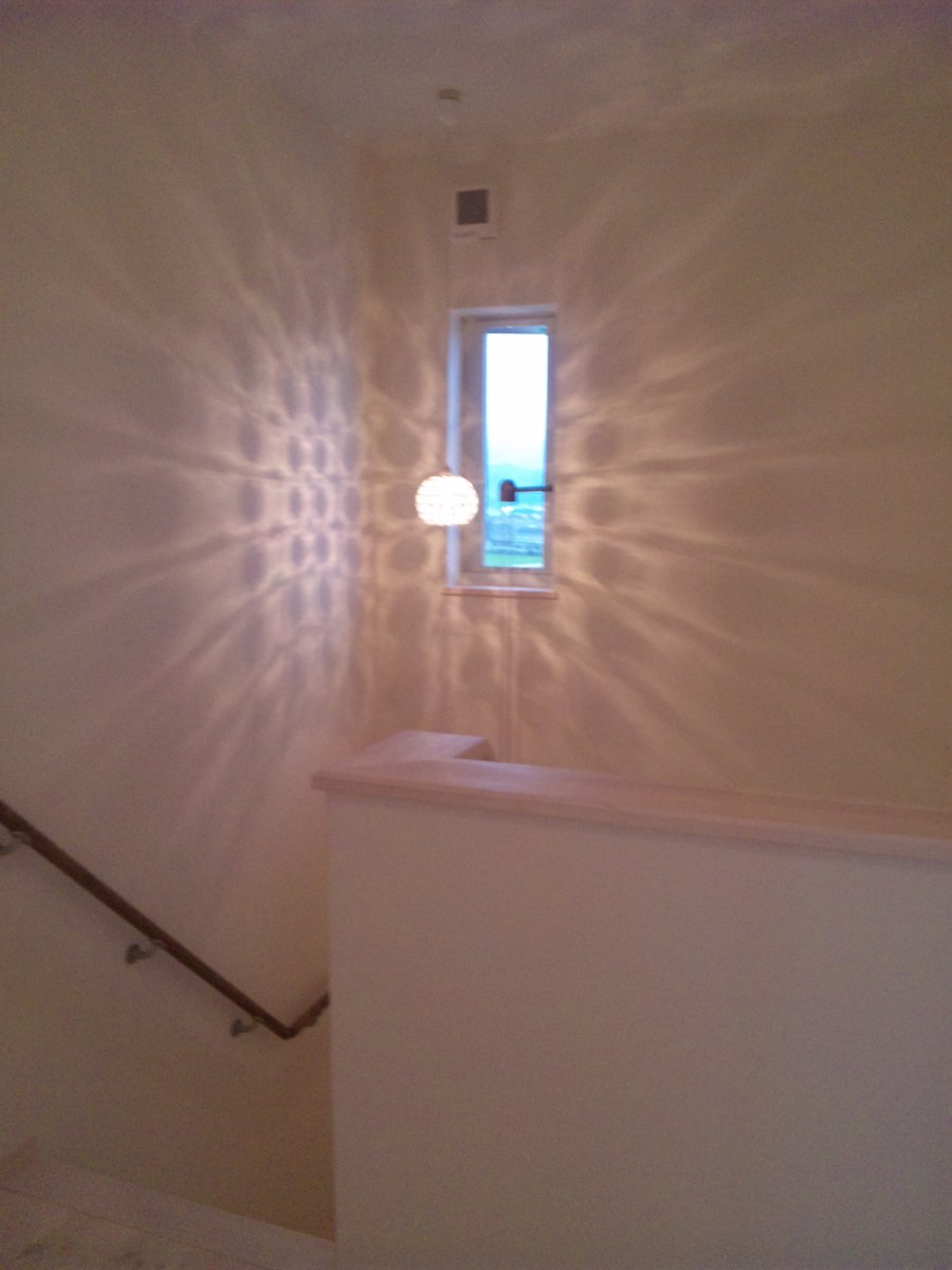 照明も洋風古民家風・・・。スイス漆喰で壁は真っ白、床も天然素材・・・素敵・・・。