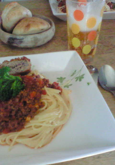 にんにく2かけをオリーブオイルで炒めたまねぎのみじん切りを炒めてミンチをいれ赤ワインでサーッと