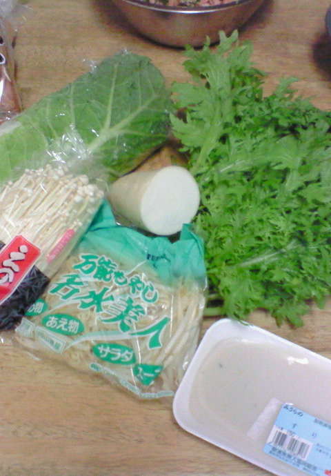 白菜、モヤシ、シメジ、えのき、豆腐など冷蔵庫の野菜を入れます。
